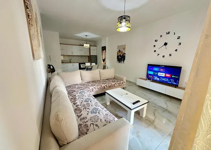 Seaview Beachfront Apartment Saranda Terraces, di 78 m^2, che offre viste sulla città, si trova a una distanza di 3 km dai Lëkurësi Castle a Sarandë. Il Wi-Fi è disponibile per le necessità lavorative o di svago degli ospiti.